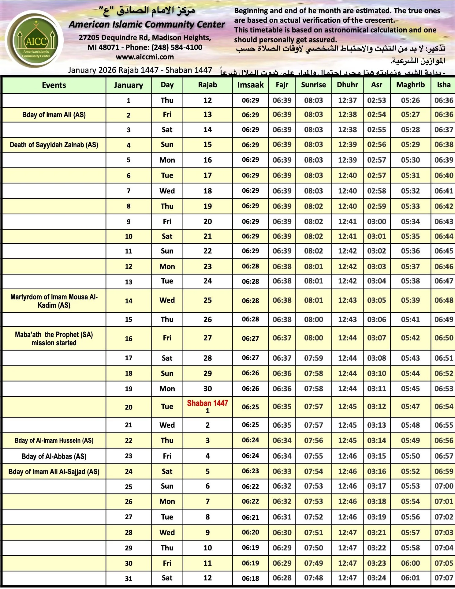 2026 Prayer Schedule January February Ramadan 2026 March April May June July August September October November December